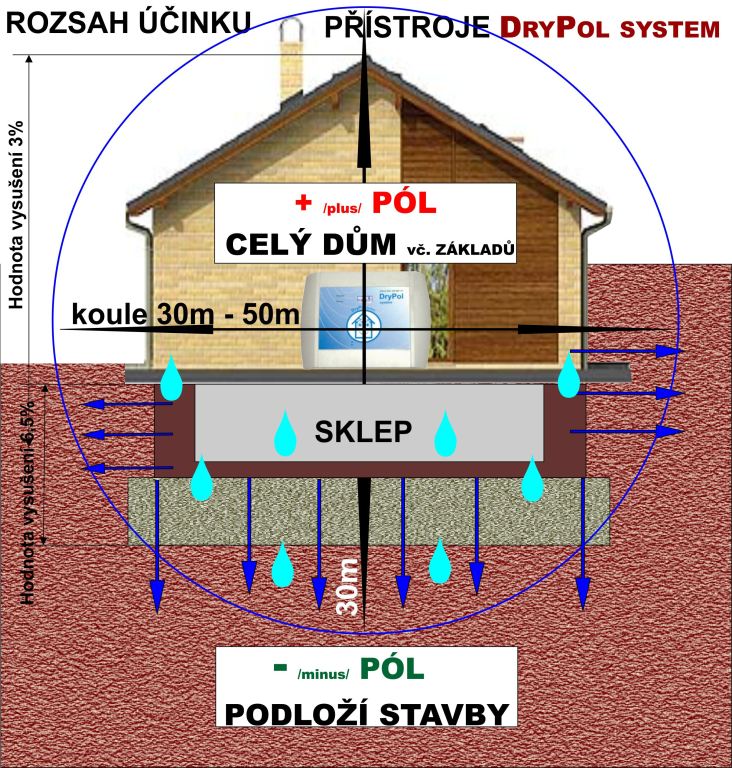 V několika měsících po instalaci elektrofyzikálního přístroje DryPol system putuje voda v kapilárních řečištích zdiva zpět do půdy - tedy od + (plus) k - (mínus) pólu až do vyschnutí celé stavby. Využívá se zemského magnetismu, v tomto případě elektromagnetismu. Silný minusový elektromagnetický pól máme v podloží stavby, mírný kladný dodáme přístrojem DryPol system do molekul vody ve zdech obsažených. Polarizací molekul vody ve zdech dosáhneme vyschnutí a trvalou hydroizolaci Vaší stavby. Tento typ vysoušení a hydroizolace je efektivní a elegantnější než klasická drátová elektroosmóza, nemluvě o pořizovací ceně obou technologií.